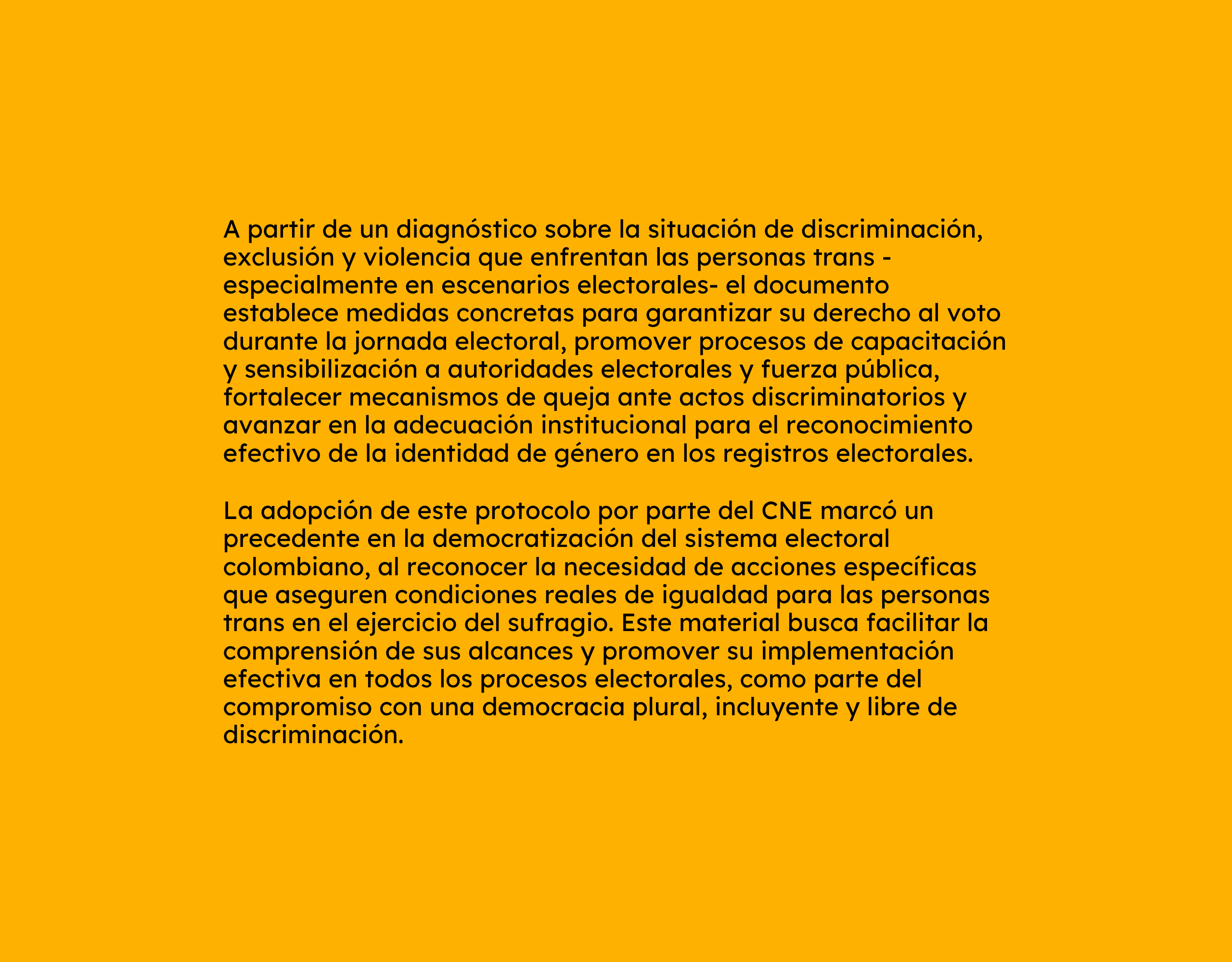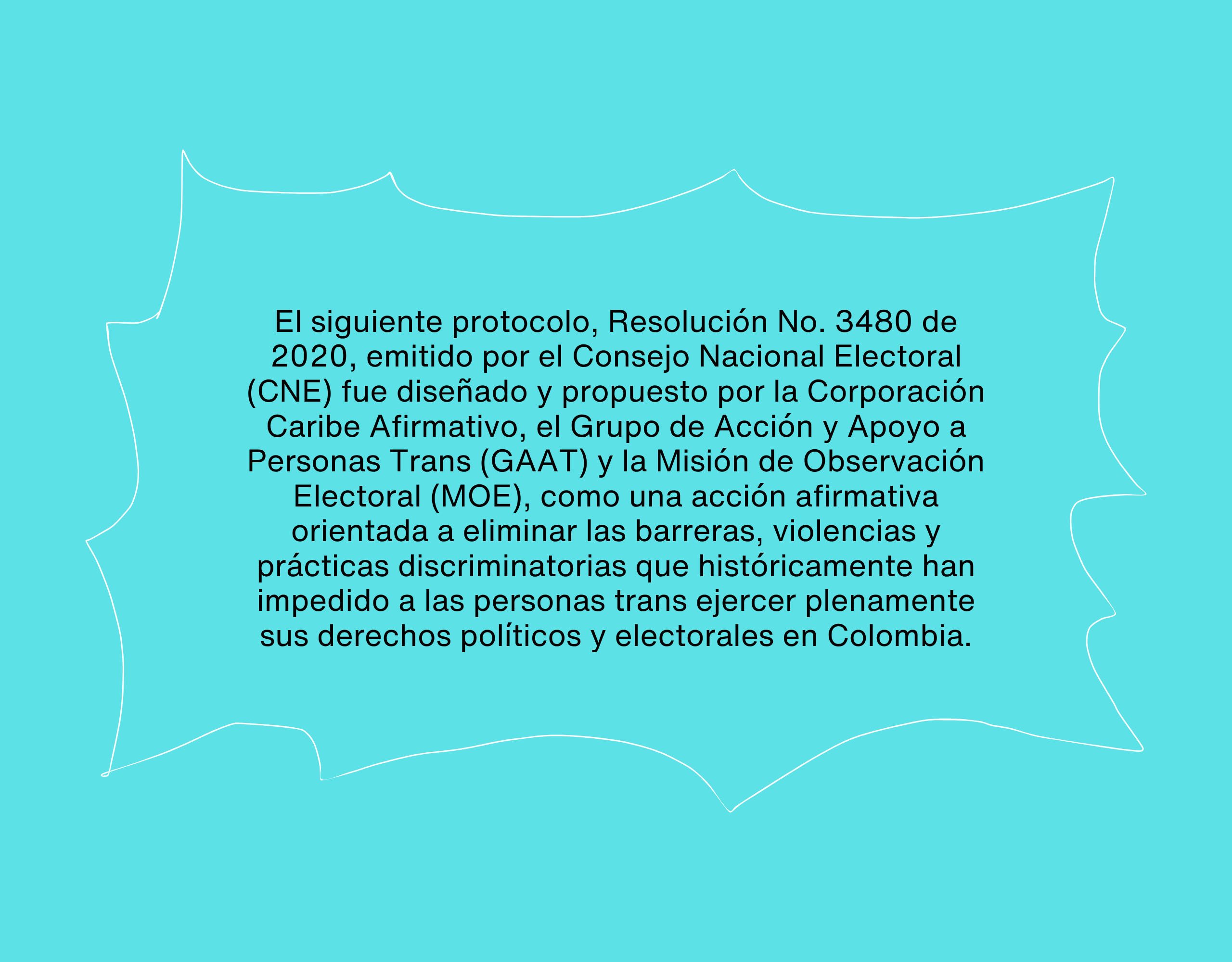 El siguiente protocolo, Resolución No. 3480 de 2020, emitido por el Consejo Nacional Electoral (CNE) fue diseñado y propuesto por la Corporación Caribe Afirmativo, el Grupo de Acción y Apoyo a Personas Trans (GAAT) y la Misión de Observación Electoral (MOE), como una acción afirmativa orientada a eliminar las barreras, violencias y prácticas discriminatorias que históricamente han impedido a las personas trans ejercer plenamente sus derechos políticos y electorales en Colombia.
