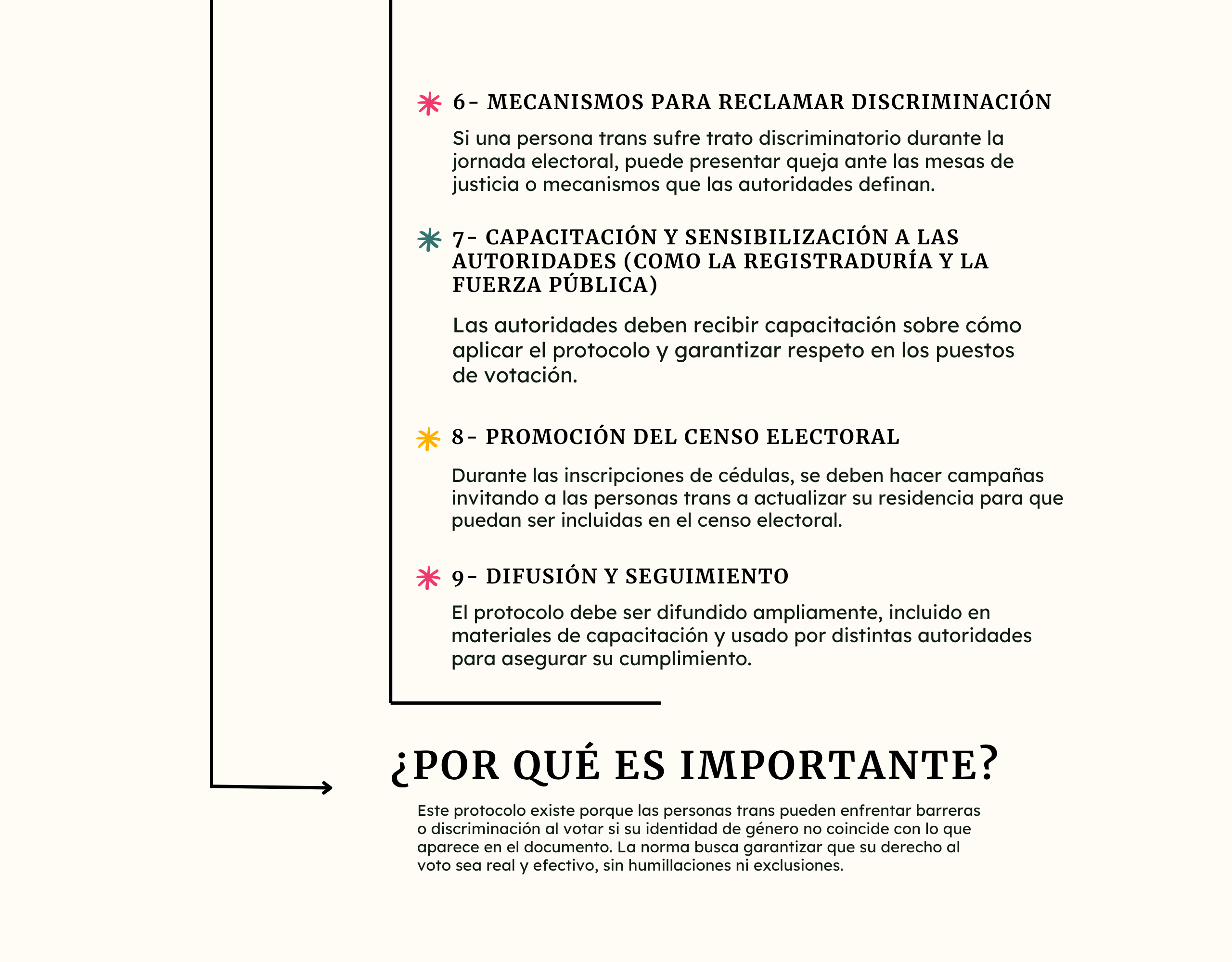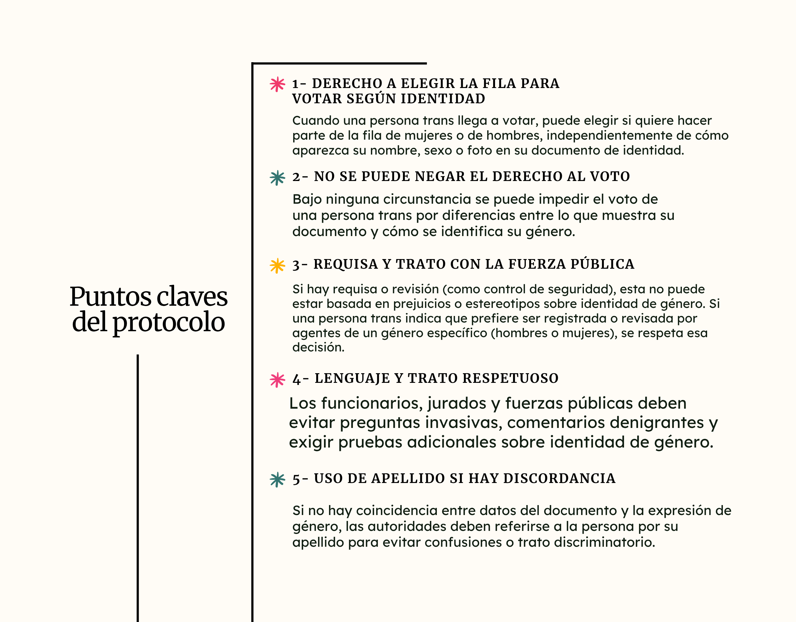 Este protocolo existe porque las personas trans pueden enfrentar barreras o discriminación al votar si su identidad de género no coincide con lo que aparece en el documento. La norma busca garantizar que su derecho al voto sea real y efectivo, sin humillaciones ni exclusiones.